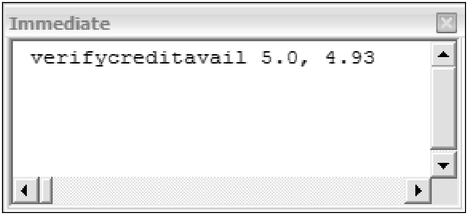 From the Immediate Window, you call the VerifyCreditAvail sub procedure and pass it the values 5.0 and 4.93. The value 5.0 represents curTotalPrice and the value 4.93 represents curAvailCredit. When the preceding If statement was evaluated, Access determined that 5.0 was greater than 4.93, and thus the message box indicating insufficient available credit was displayed.