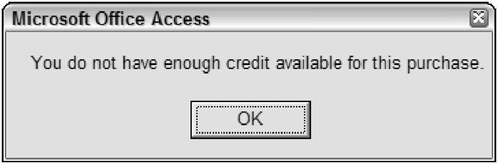 When the VerifyCreditAvail procedure executed, it evaluated the available credit and displayed the same error message you saw earlier because the value you input for curPrice was greater than the value for curCreditAvail.