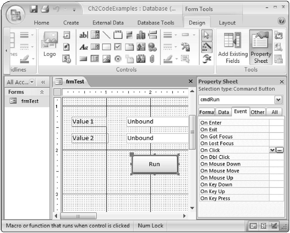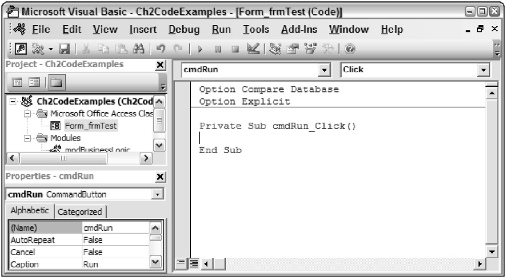 To create the empty procedure, you used the Code Builder from the frmTest form. Because you selected the click Event on the Properties window for the cmdRun button and then chose the Code Builder option, Access automatically generated an empty event procedure called cmdRun_Click. This event procedure will be called anytime the cmdRun button is clicked when the frmTest form is running.
