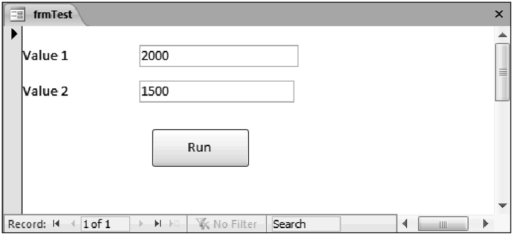 Form View from the toolbar menu with the form open. Input a value of 2000 for Value 1 and 1500 for Value 2, as shown in Figure 2-14.