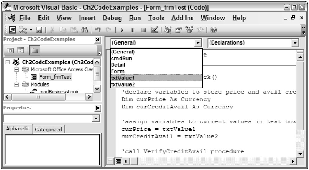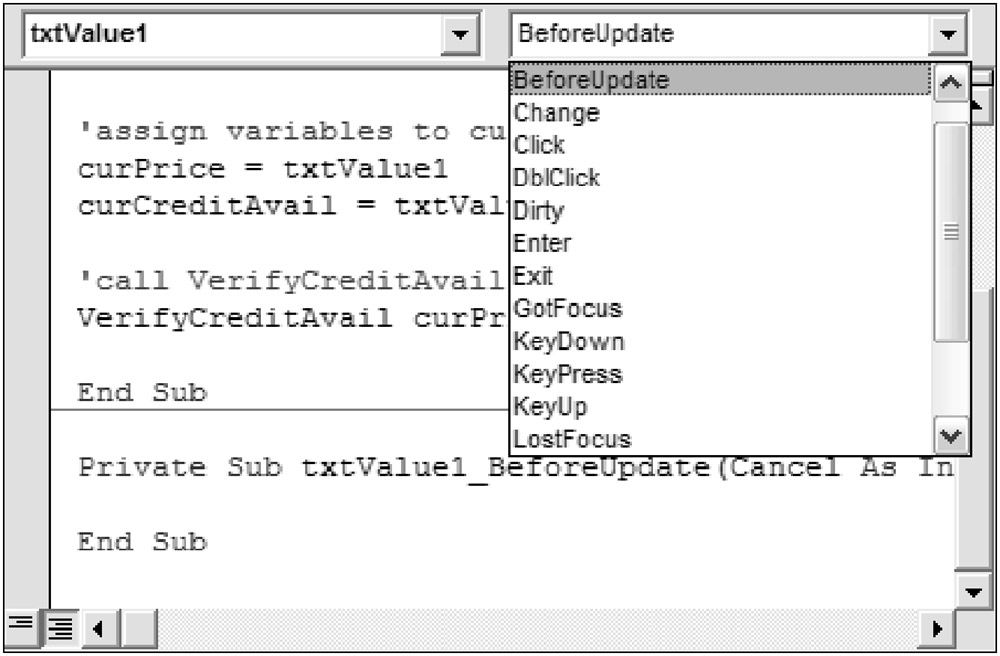 In the preceding example, txtValue1 is selected. This is the name of the first text box on the frmTest form. After you select the txtValue1 value from the Object navigation list, the values in the declarations/ procedures navigation list are then updated to correspond with those available for the txtValue1. Figure 2-17 displays some of these available procedures that can be created for the txtValue1 text box.