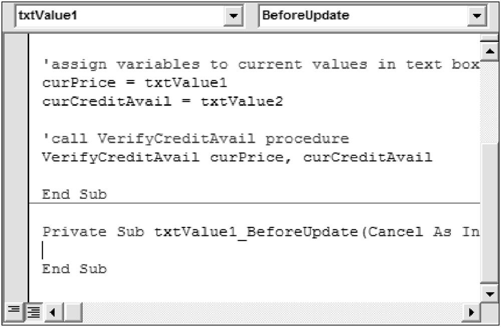The VerifyCreditAvail sub procedure accepts two variables as parameters, curTotalPrice and curAvailCredit: