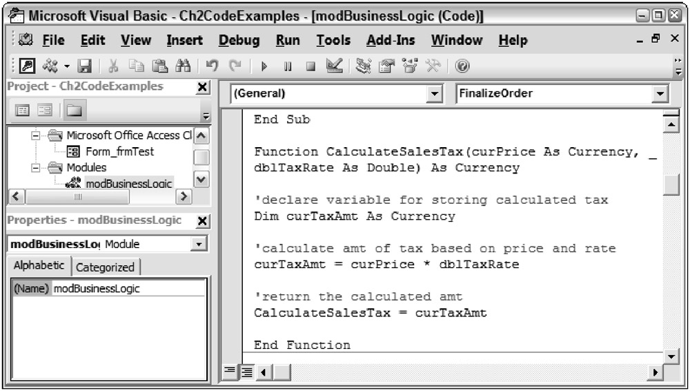 In the modBusinessLogic standard module, add the following function, called CalculateSalesTax, after the FinalizeOrder sub procedure.