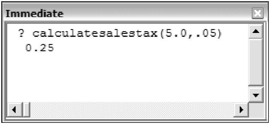 When the function procedure was tested using the Immediate Window, the preceding code was executed using the values 5.0 and .05 you specified as the parameters. The value of 5.0 was assigned to the curPrice variable, and the value of .05 was assigned to the dblTaxRate variable. The result of 0.25 was then displayed as the result.