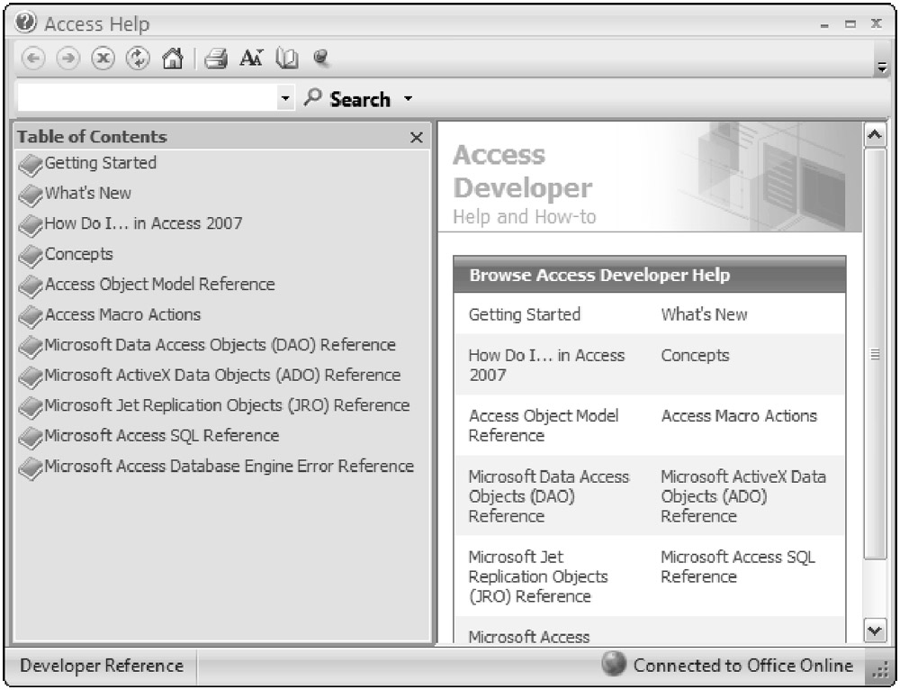 As mentioned earlier in the chapter, if a security warning appears, you may need to enable macros and VBA code when you open Access in order for the code to execute. The Trust Center can be used to further customize the security settings in Access. To access the Trust Center, click the Office Button, and then choose Access Options near the bottom. Select the group called Trust Center from the left navigation area. |