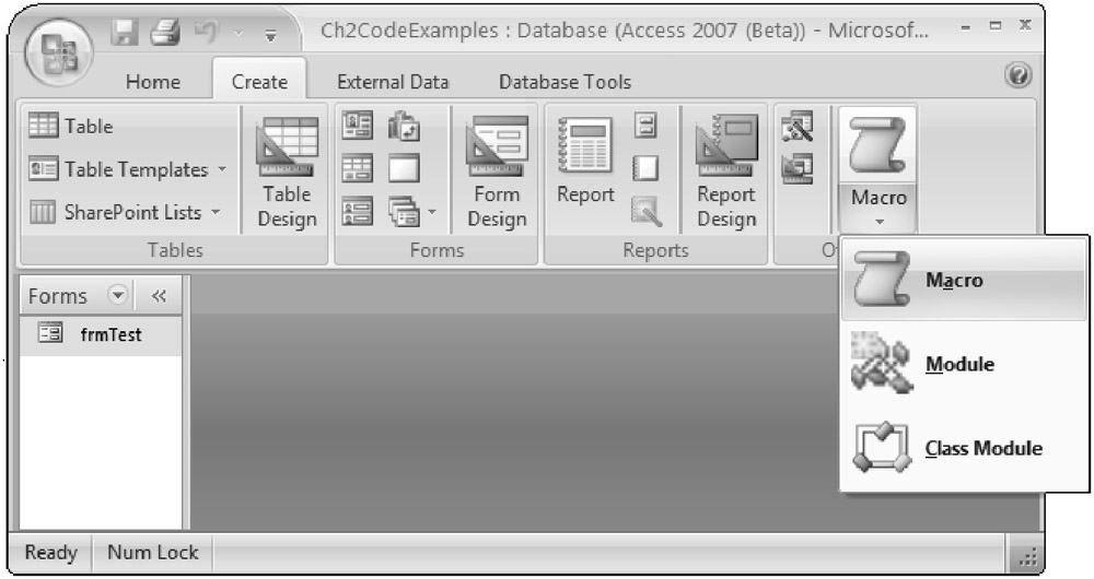 The AutoExec macro is one example of a macro that you can use to control which form loads when the database opens. Let’s create a new AutoExec macro to open the frmTest form you created earlier any time the Ch2CodeExamples.ACCDB file is opened. Create a new macro by selecting the Create ribbon on the toolbar, and then selecting Macro from the group called Macro, as shown in Figure 2-22.
