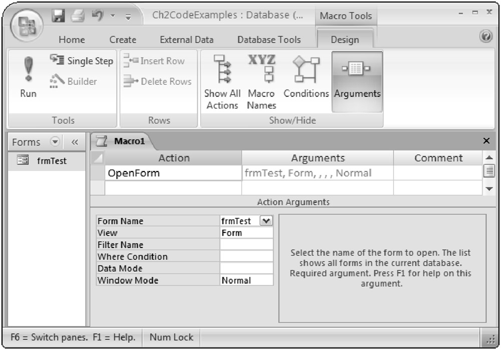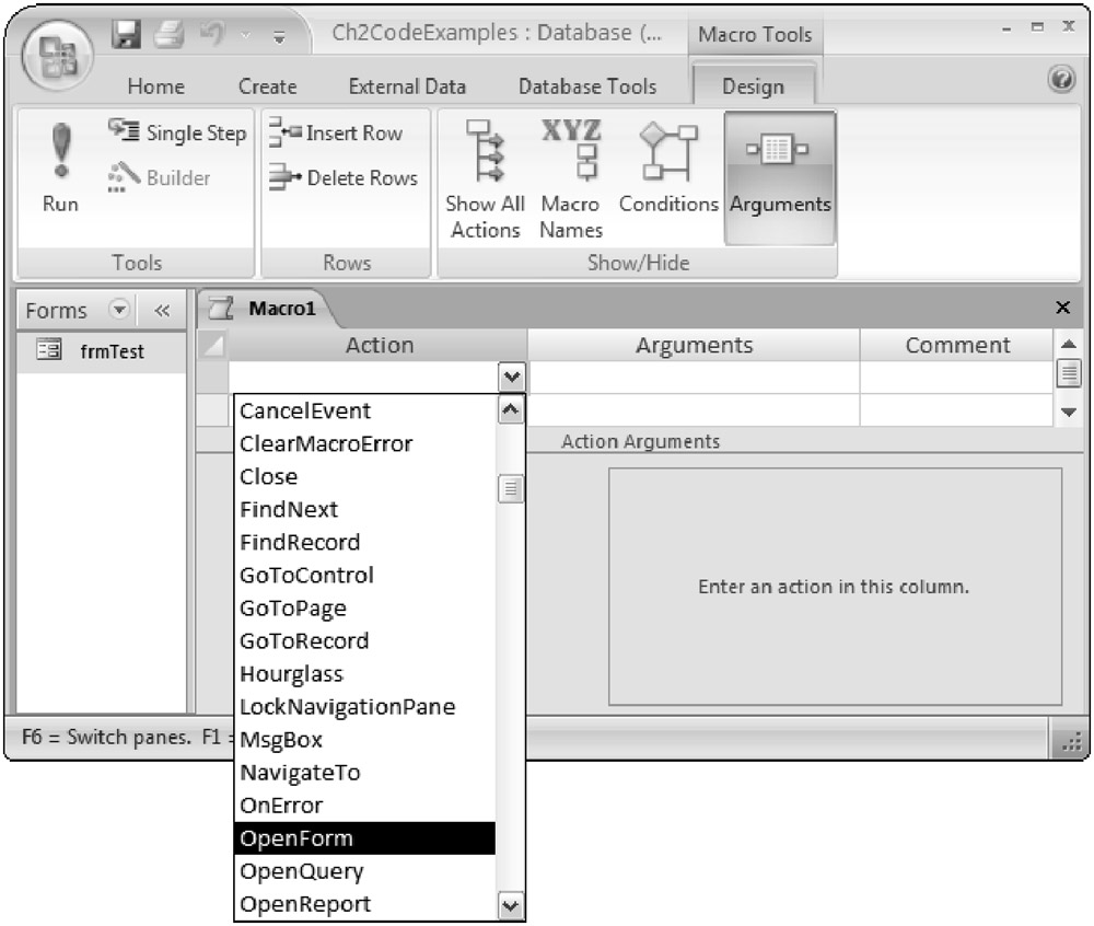 A new empty macro is displayed. To have a form load, select the OpenForm action from the action list, as shown in Figure 2-23. Next, to specify which form to open, select frmTest from the Form Name field, as shown in Figure 2-24.