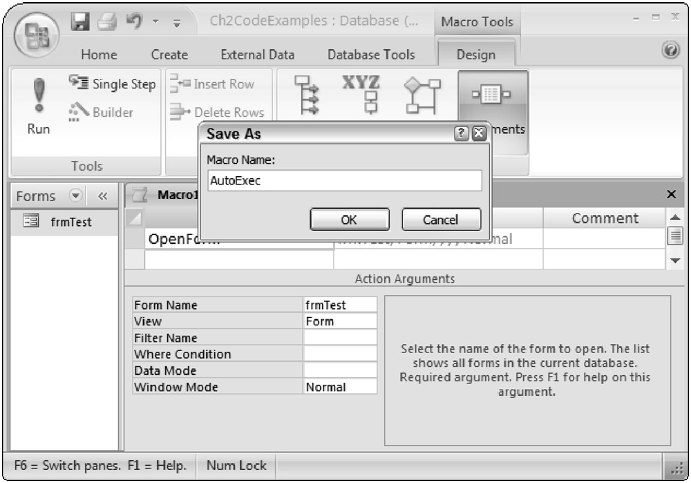 Finally, you need to save the macro, such as by selecting the Save icon or by selecting the X in the right corner of the macro window (not of Access 2007 overall or you will close Access). You will be prompted to save the macro. Name the macro AutoExec, as shown in Figure 2-25, so it will run when the database opens. Whenever an Access database opens, it looks for a macro named AutoExec, and if one is found, the commands it contains are executed automatically.