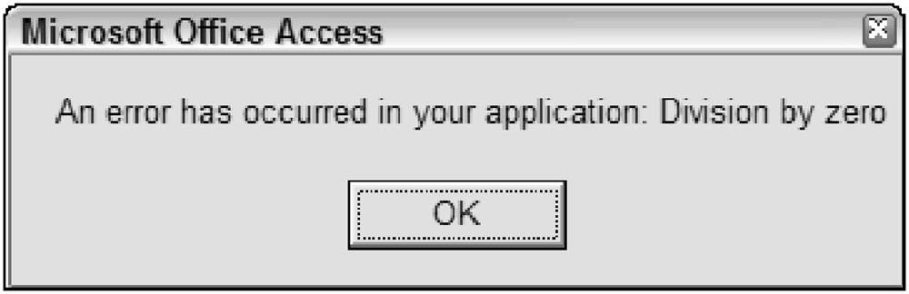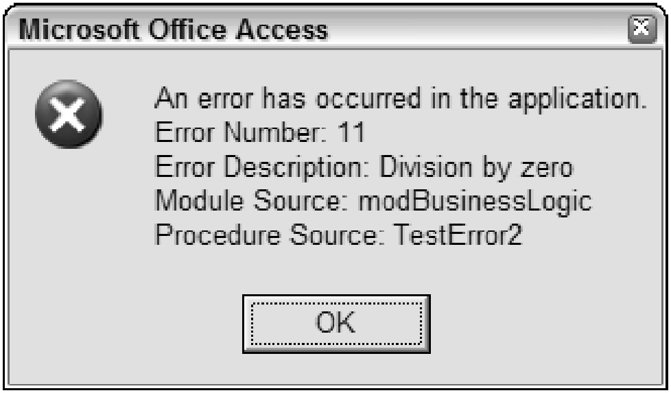This generic error handler can be called from every procedure you write, changing only those variables that specify the current module and procedure. Errors can also be logged to a table, written to a file, or e-mailed, but those options are beyond the scope of this book.