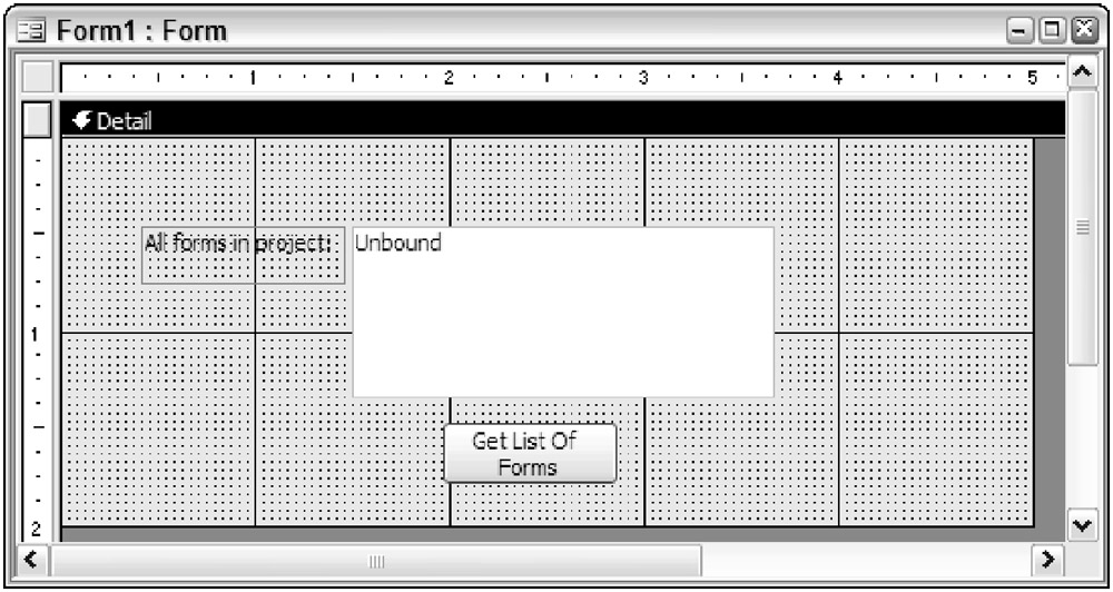 Next, select the command button control. Set the Name property to cmdGetForms and the Caption property to Get List of Forms.
