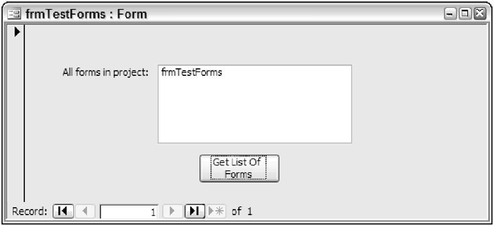 Run the form by selecting View from the toolbar. Click the Get List of Forms command button. You should see the names of all open forms displayed in the list box control, as shown in Figure 3-19.