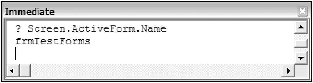 In the current example, you used the Immediate Window to find the name of the active form on the screen, using the ? Screen.ActiveForm.Name command.