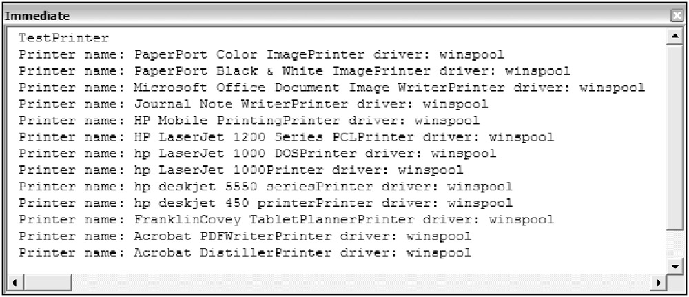 Run the TestPrinter procedure from the Immediate Window, and you will see a list of printers available on your computer, similar to Figure 3-21.
