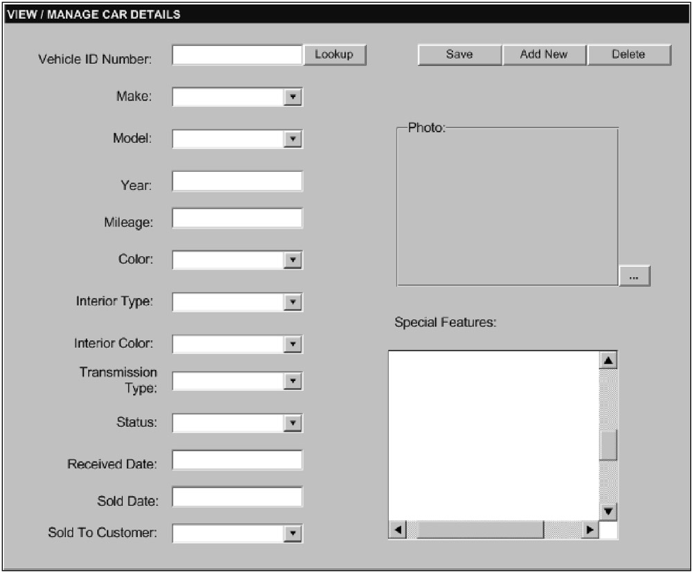 Note that the example used for the frmCarDetails form illustrated just a partial set of the controls that would be included on the production version of the Manage Cars screen. Only the VehicleIdNumber field was used for sake of simplicity. |