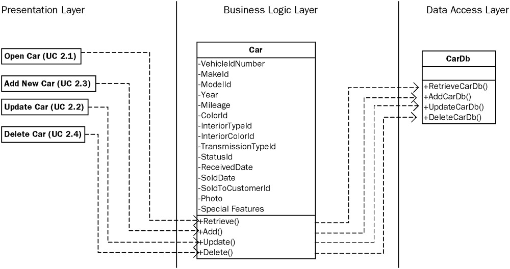 The Class Diagram in Figure 4-2 fits into the business logic layer. Now that you have created the business logic layer of the application, the other two remaining layers are really easy to create. Any call to the database will be included in a class in the data access layer. For each business logic layer class module that has a method requiring data from the database, you create a corresponding class module in the data access layer. Thus, the business logic layer (the Car class) will not make any calls directly to the database to get data. Instead, the Car class calls a method in a CarDb class in the data access layer, which, in turn, gets the data from the database, as you can see in Figure 4-3.
