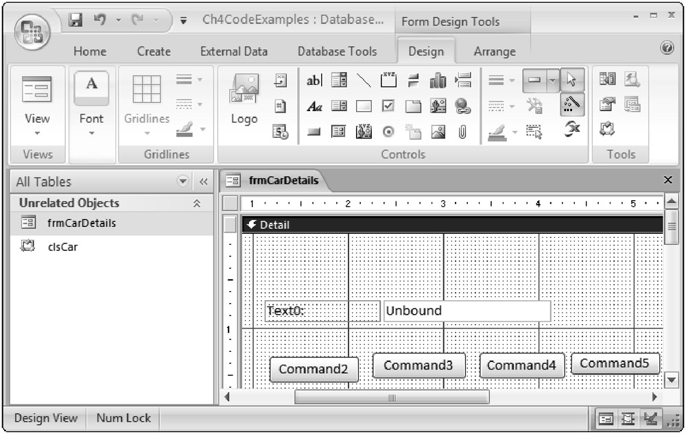 Return to the database window and create a new form. To do so, select the Create ribbon, and then New Form. Switch to design view by selecting the Home ribbon, and then Design View from the View drop-down list. Use the controls on Design ribbon to select and draw one text box and four command buttons on the new form, as shown in Figure 4-4. Click cancel on the wizards that open as you draw the buttons on the form, as you do not need them.