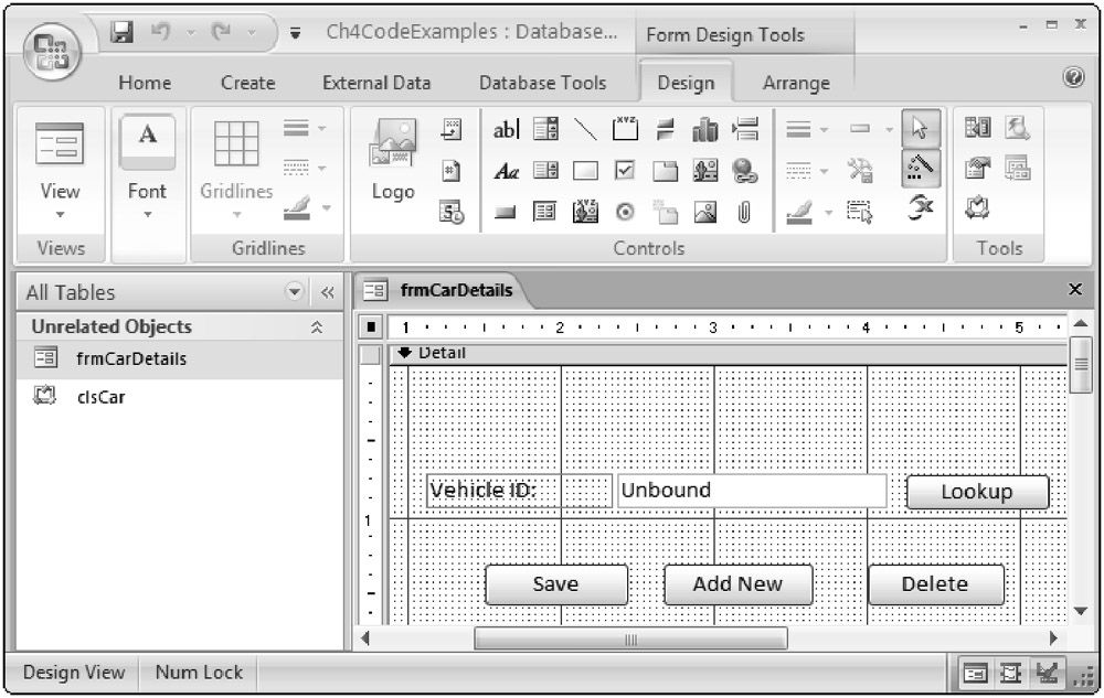 You started by creating a new form called frmCarDetails and adding a text box control and four command buttons. The text box control is used to enter and display the Vehicle ID, and the four command buttons are used for Lookup, Save, Add New, and Delete functionality. After modifying various properties for the controls, you declared an objCar variable to store an instance of the clsCar class. Notice that the WithEvents keyword is used as part of the declaration so that the form can detect the custom event when it occurs.
