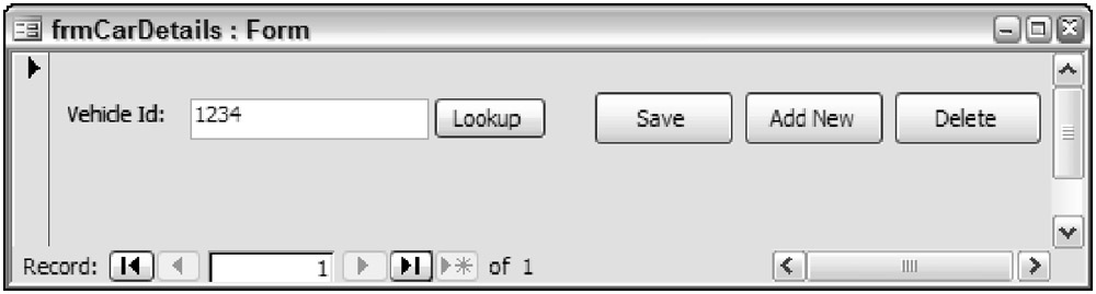 Run the form by selecting the Home ribbon, and then Form View from the View area. Enter a value for the VehicleId text box on the form, as shown in Figure 4-6.