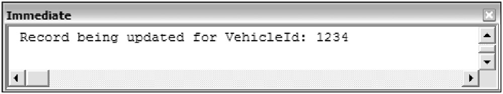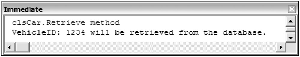 Next, you ran the form, entered a value for the VehicleId text box on the form, and selected the Lookup button. The Immediate Window then displayed the messages indicating that the Retrieve method of the clsCar object had executed. After you clicked the Save button on the form, the Immediate Window displayed messages indicating the Update method had executed, and displayed a message box indicating that the record was successfully updated. Remember that this is the code you previously added to the Update method to raise the custom event ActionSuccess. In just these few steps, you not only tested the properties, methods, and event for your custom object, but you also used several properties, methods, and events for the existing objects.