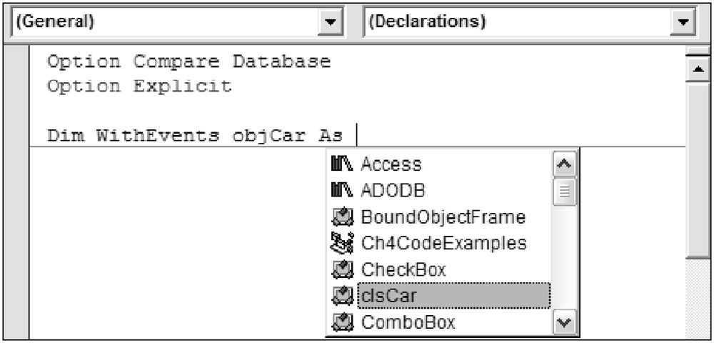 As shown in Figure 4-10, as you typed the declaration for the object, the name of the clsCar class that you created appeared in the drop-down list along with existing objects that you did not create.