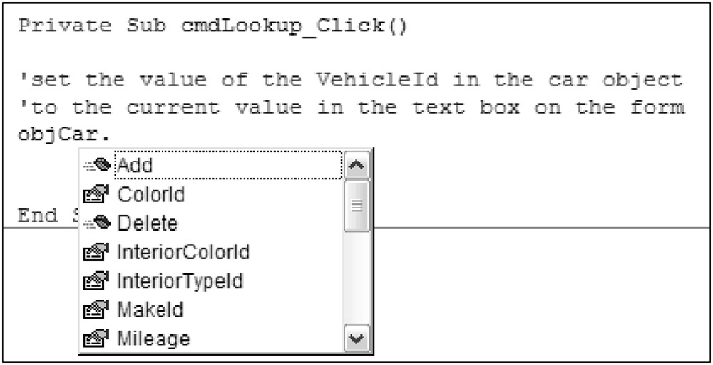 Private Sub cmdLookup_Click() 'set the value of the VehicleId in the car object 'to the current value in the text box on the form objCar.VehicleIdNumber = txtVehicleId 'call the Retrieve method objCar.Retrieve (objCar.VehicleIdNumber) End Sub