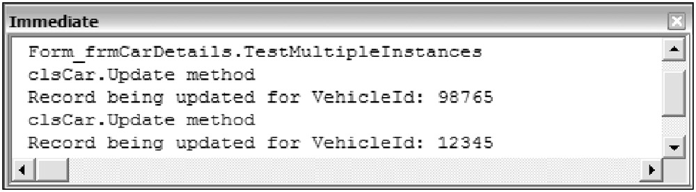 As shown in Figure 4-12, the Immediate Window displays the messages generated from the Update method indicating that the record was being updated for each respective instance of the class.