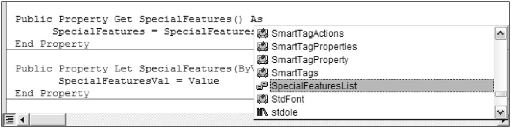 In the property declarations, you see the SpecialFeaturesList enumerated type in the list of objects available, as shown in Figure 4-13.