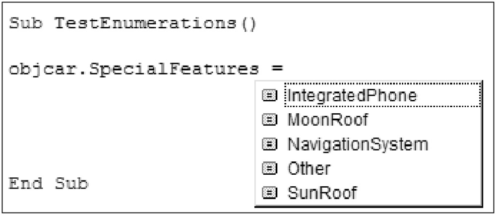 Now anytime you try to set that property using an assignment statement, you are limited to those values specified in the enumeration declaration, as shown in Figure 4-14.