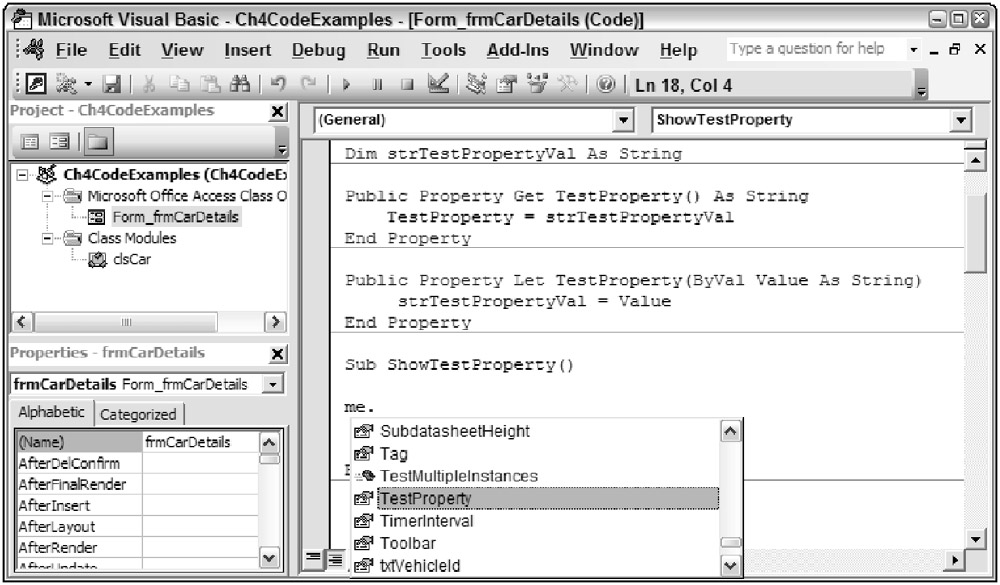 In the frmCarDetails class module, add a new procedure called ShowTestProperty and type the Me keyword followed by a period, as shown in Figure 4-15. Note that the TestProperty that you just added in Step 2 now appears, and you can select it from the list and assign it a value if desired. You can delete the ShowTestProperty procedure, as it was just used to show you that the new property you just added is now available.