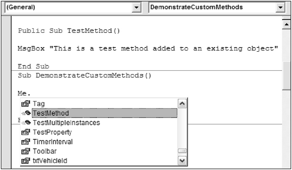 First, you added the new method to the existing frmCarDetails form. Then, when you referred to frmCarDetails in code using the me keyword, you saw that the custom method you just added was in the drop-down list along with the custom property you just created and the original properties and methods. Just like properties, methods can be added to nearly any existing object.