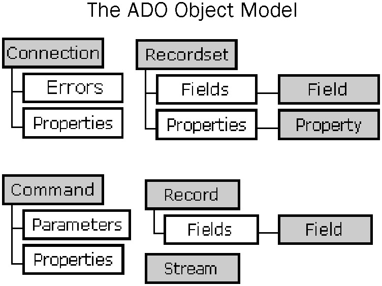 Figure 5-1 provides an overview of the ADO object model. At the highest level of the object model, several collections exist: Connection, Recordset, Command, Record, and Stream.