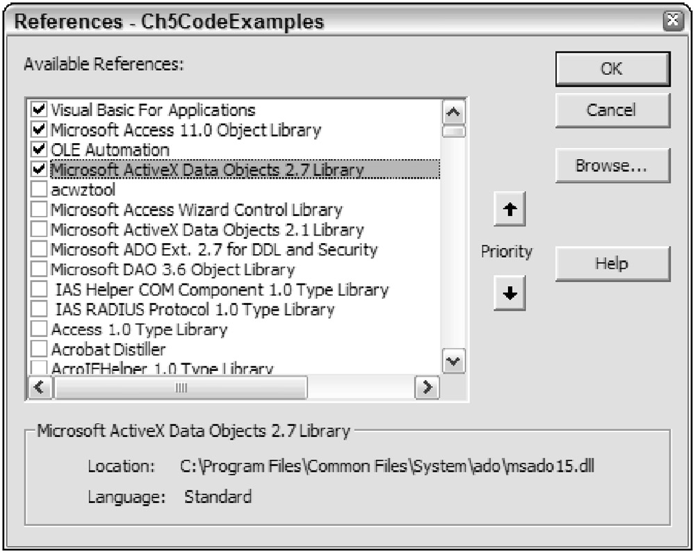 References from Visual Basic Editor and choosing a library from the list. Figure 5-2 shows an example with a reference set to version ADO version 2.7.