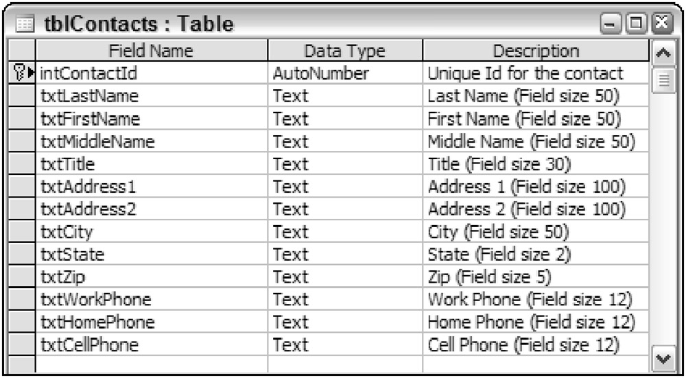 Create a new table in the database by selecting the Create ribbon on the toolbar and then choosing Table from the Tables grouping. The table should be named tblContacts and should have the fields illustrated in Figure 5-3. Note that the field sizes are listed as part of the description for convenience purposes only, so that, when creating the table, you can see what size to set for each field.