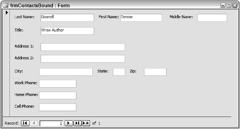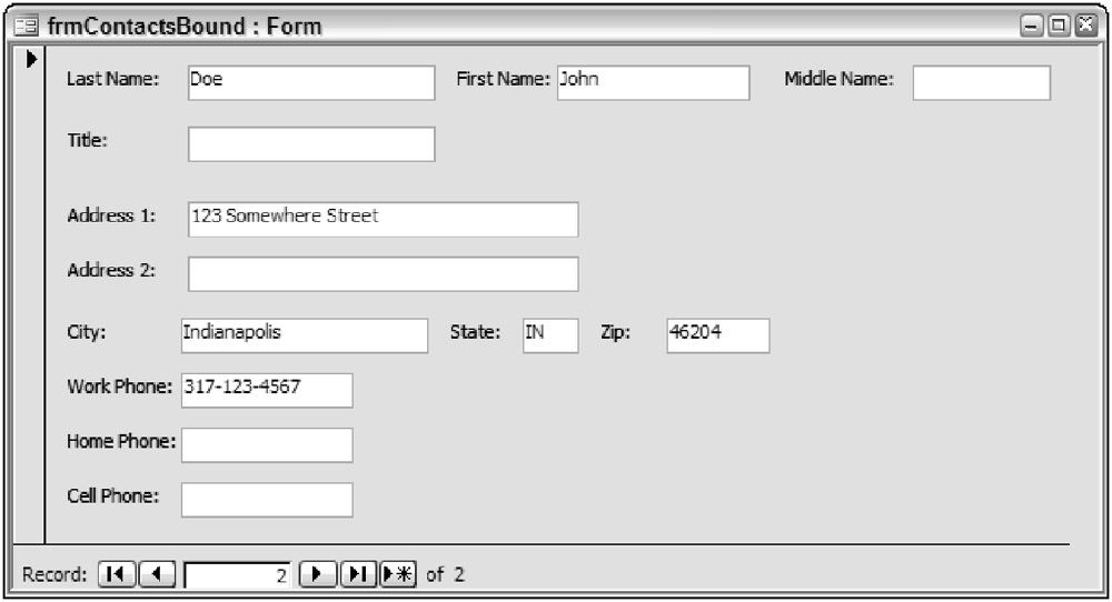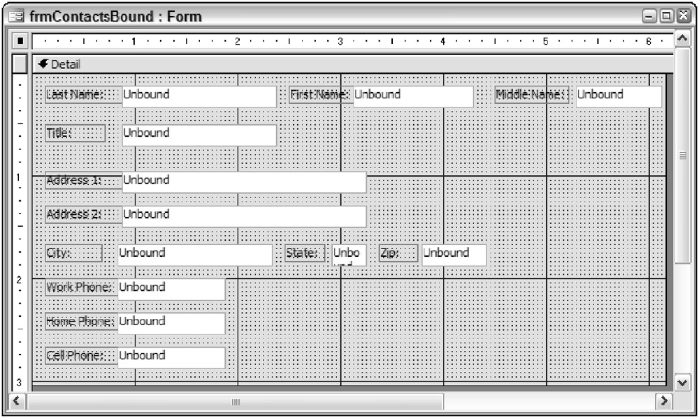 Create a new Blank Form named frmContactsBound. Use the ToolBox to drag and drop 12 text box controls onto the form. Modify the Name property for each text box to the following: txtLastName, txtFirstName, txtMiddleName, txtTitle, txtAddress1, txtAddress2, txtCity, txtState, txtZip, txtWorkPhone, txtHomePhone, and txtCellPhone, respectively. Also rename the Caption property for the corresponding label of each text box, as shown in Figure 5-4.