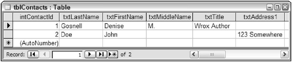 Now that you have a basic idea of various ADO settings, you can put the concepts into practice by building a contacts form that connects to and displays data from a recordset. Assume that the contacts form will be used by a U.S. company that does not deal with foreign addresses.