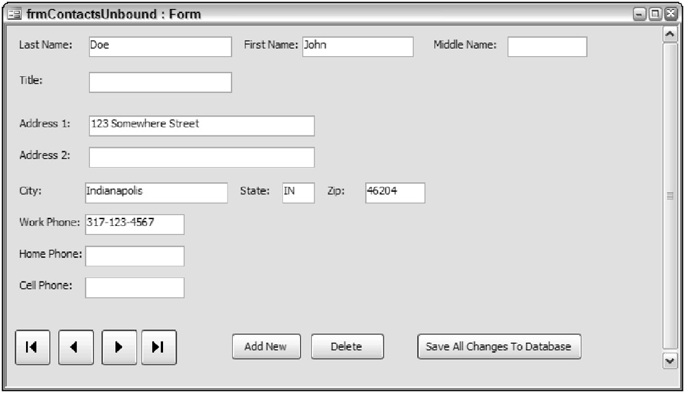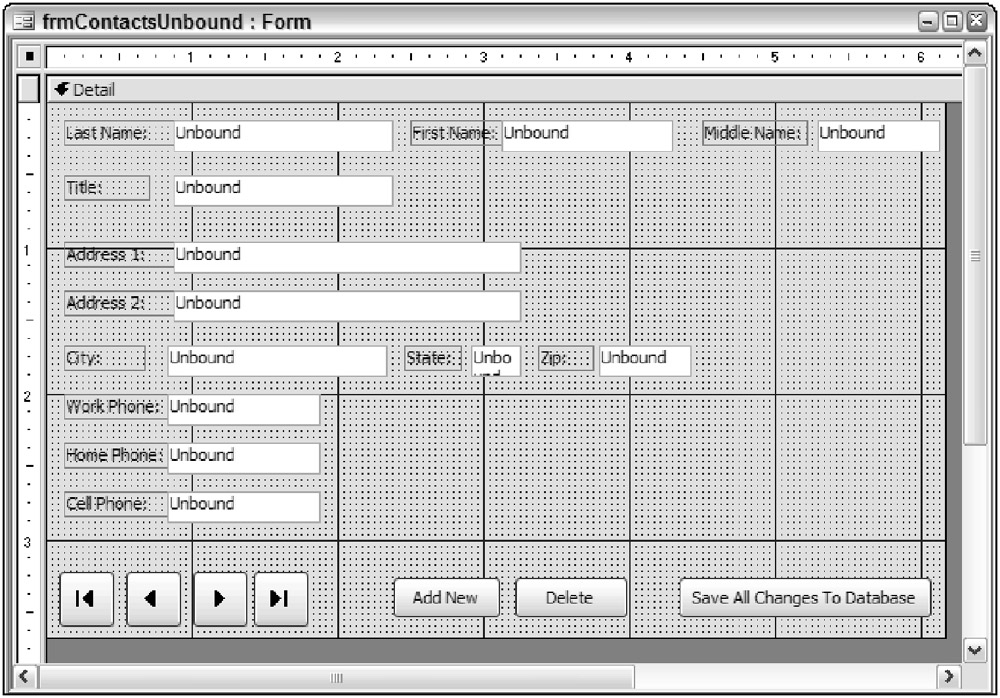 First, you made a copy of the existing frmContactsBound and renamed it to frmContactsUnbound. You then added some additional controls, namely seven command buttons to the form. The command buttons were labeled for record navigation, add, delete, and save functionality.