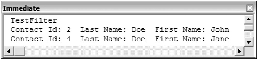 The preceding example uses the Filter property to filter the recordset down to records that start with D. To prove the filter worked, all the records remaining are displayed in the Immediate Window, as shown in Figure 5-13.