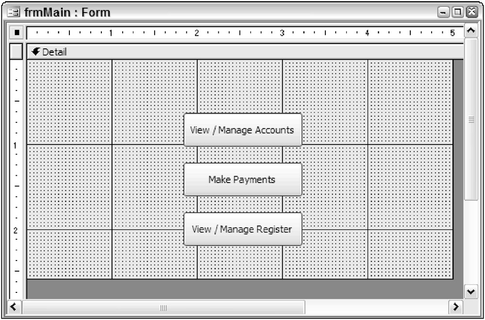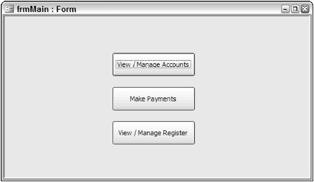 Open frmMain in design view and add three command buttons. Name the command buttons cmdAccounts, cmdPayments, and cmdRegister. Set the caption of the command buttons to View/Manage Accounts, Make Payments, and View/Manage Register, respectively. Also, set the Record Selectors, Navigation Buttons, and Dividing Lines properties of the form to No. An example of the form at this point is shown in Figure 6-1.