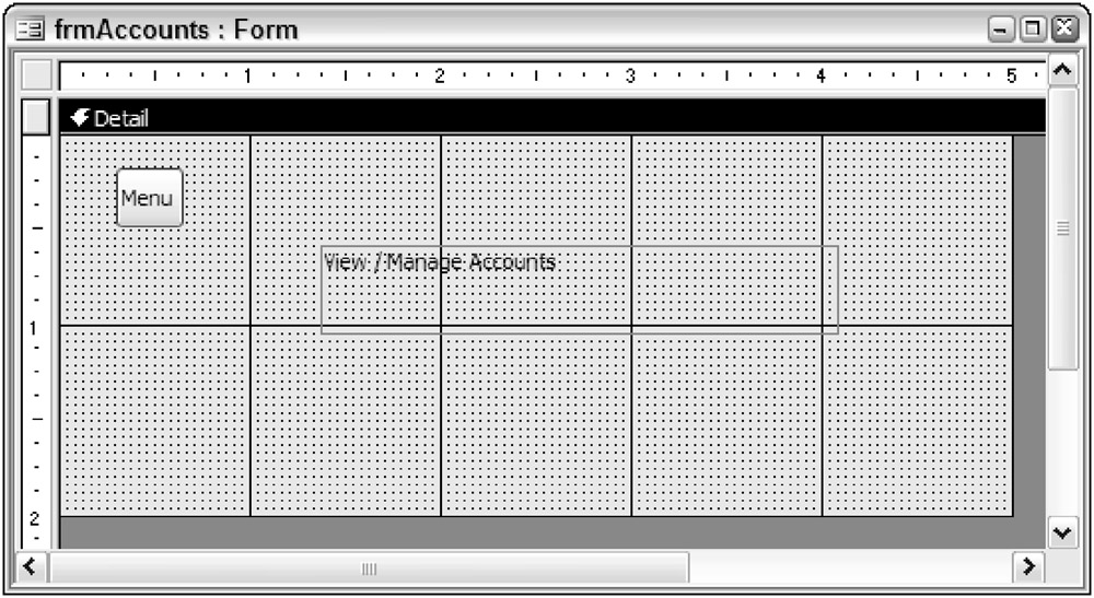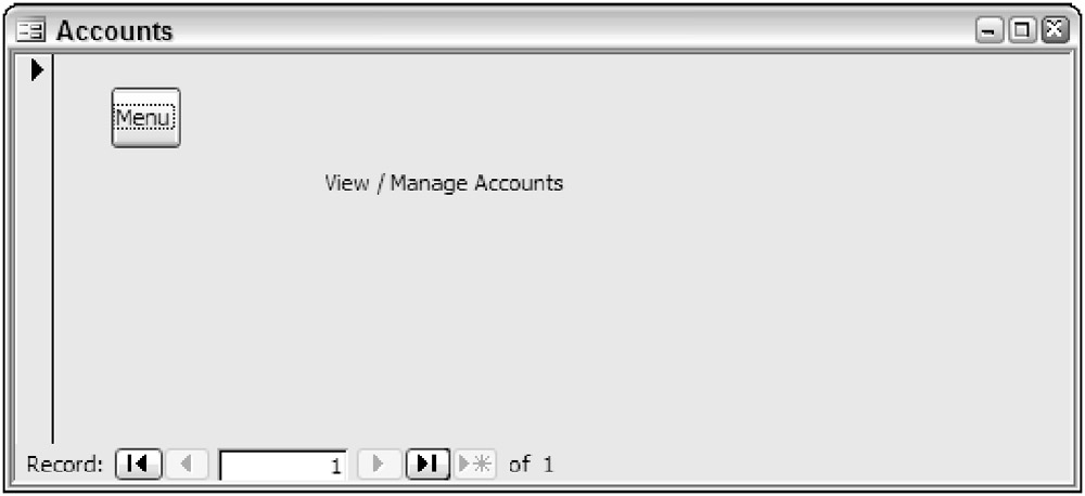 Open the frmAccounts form. Add a command button to the form. Change the Name property of the command button to cmdMenu and change the Caption property to Menu. Add a label to the form and type View/Manage Accounts in the label. The form should be similar to that shown in Figure 6-2.
