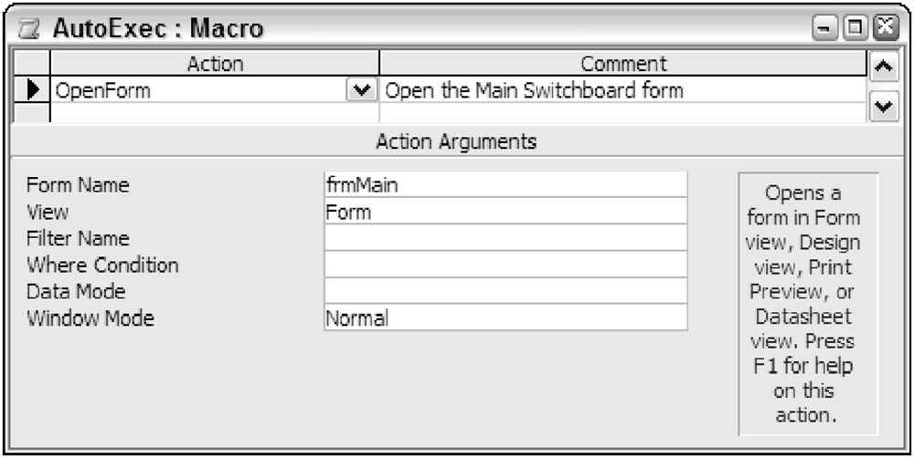 From the database window, create a new macro named AutoExec that contains the OpenForm command for frmMain, as shown in Figure 6-3.