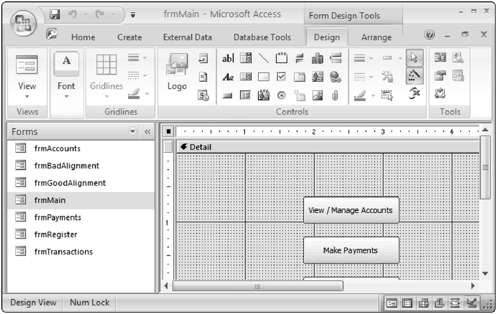 Prior to reading this book, you probably worked with a variety of controls on Access forms, such as labels, text boxes, command buttons, and combo boxes. As you are already aware, controls can be added to a form using the Controls from the Design ribbon on the toolbar, as shown in Figure 6-6. Now turn your attention to a related topic: working with controls.