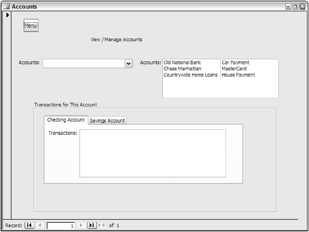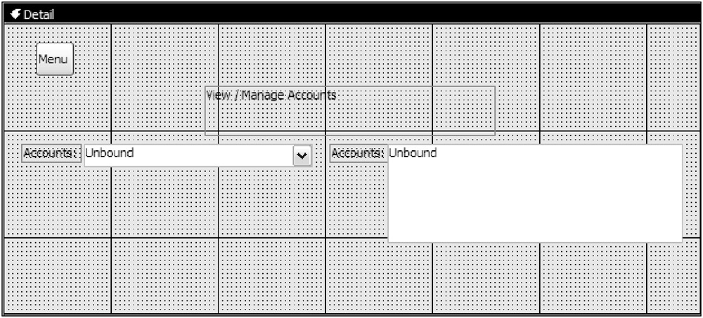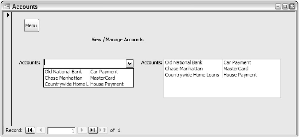 Set the Name property of the combo box to cboAccounts and the Name property of the list box control lstAccounts. Set each of the labels to Accounts. The form should look similar to the one shown in Figure 6-7.