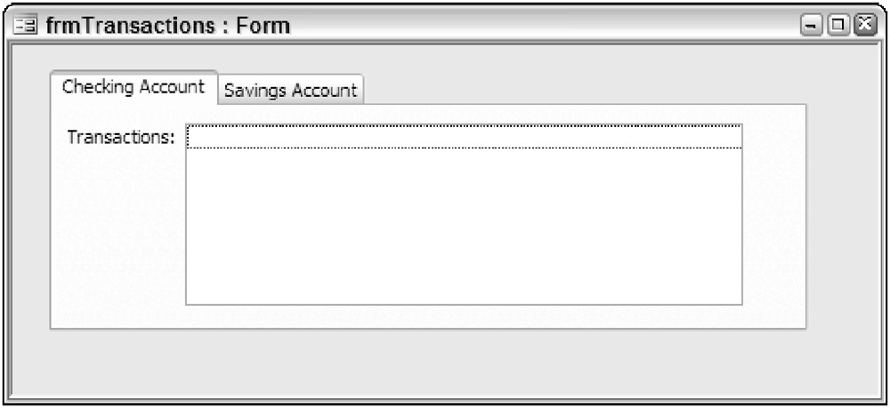 When you have a lot of data that needs to be displayed on a single form, tab controls provide one way or organizing data on a single form into separate components. A tab control allows you to place separate controls on each tab. For example, you may have one tab that contains checking account information and another tab that contains savings account information, as shown in Figure 6-9.