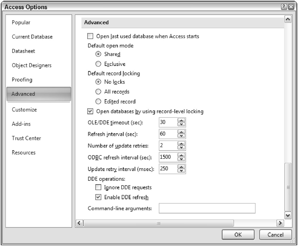 The type of record locking that is used for bound forms is determined by the Options settings. To modify the record locking options for bound forms, select the Office button, and at the button on the pop-up menu click on Access Options, and the select Advanced on the left menu. A dialog box like the one shown in Figure 12-1 is displayed. You may have to scroll down to see the options shown in Figure 12-1.