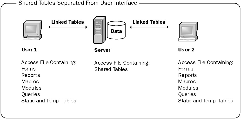 One way to improve the capability of multiple users to work with an Access application is to separate the data tables from the user-interface aspects. If you put a single Access database that contains the entire application on a file server and allow multiple users to access it simultaneously, you are asking for trouble. A better solution is to separate the user interface from the data tables so that each user has his own copy of the user interface. The data tables can be stored in a separate database file on a server and accessed from each copy of the user interface. This approach is illustrated in Figure 12-2.