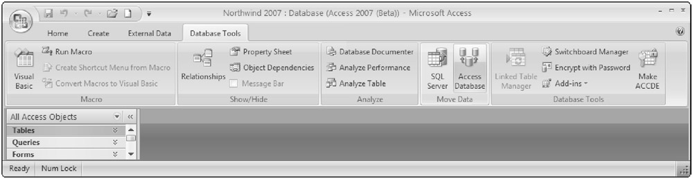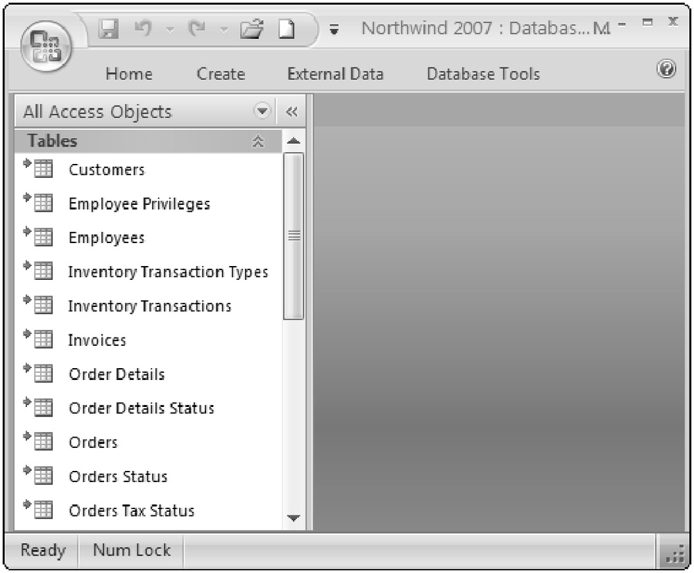 Open the existing database you want to split. Open the Northwind.accdb sample database if you have it on your computer. If not, open one of the databases created in the prior chapters. The steps are the same in either case.