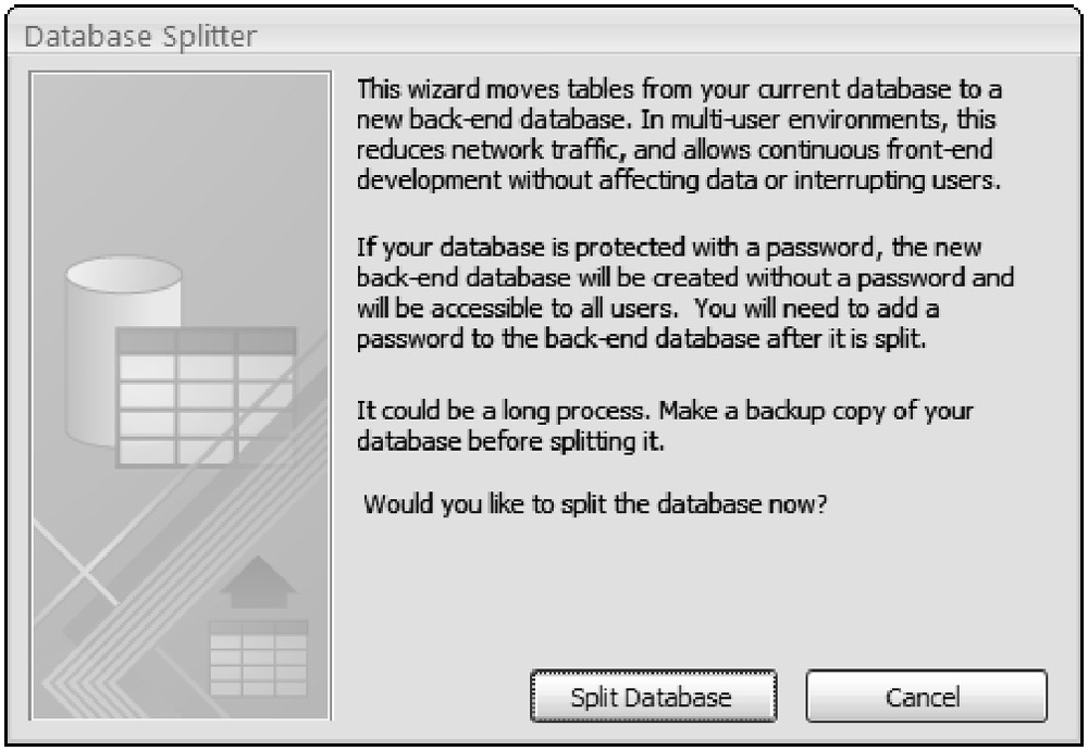 Another option is to build the application in one database first and then perform the separation manually or by using the Database Splitter. To do so manually, you simply export the data tables to another database, delete the tables from your original database so that only the linked tables remain, and add a link to that external database. Now let’s look at how to use the Database Splitter Wizard.