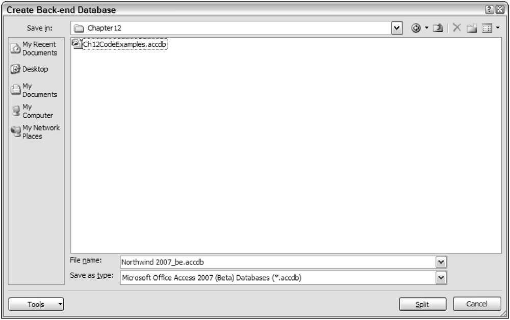 The Create Back-End Database dialog box is displayed, as shown in Figure 12-5. Specify the name and location of the database where you want the data tables to be stored. If you are splitting the Northwind database, specify a file name of Northwind_be.accdb. Then, click the Split button.