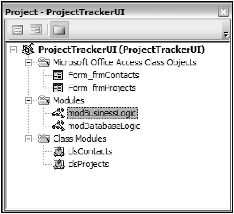 Throughout this book you learned that VBA code can be written in various places, such as class modules that are independent or associated with a form, as well as in standard modules. Next, you turn your attention to writing the code that will implement the desired features of the Project Tracker application. You will be creating the custom class modules first, then the standard modules, and finally the code for the forms to call the other modules. An example of how the Project Explorer will look in the Visual Basic Editor when you’re finished is shown in Figure 13-23.