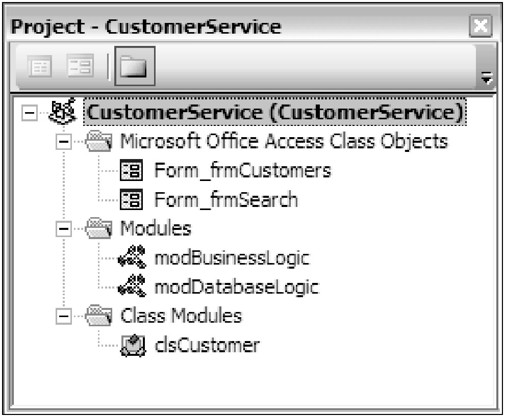 Next, turn your attention to writing the code that will implement the desired features of your Customer Service application. VBA code can be written in various places, such as class modules that are independent or associated with a form, as well as in standard modules. Just as in the prior case study, you will create the custom class module first, then the standard modules, and finally the code for the forms to call the other modules. An example of how the Project Explorer will look in the Visual Basic Editor when you’re finished is shown in Figure 14-25.